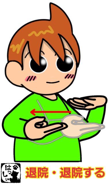 手話単語:870 【退院】【退院する】 2018年07月11日 こんにちはヾ(´ω`=´ω`)ノ【退院・退院する】左の手のひらに乗せた右手の人差し指と中指の2指をスッと手前に引き寄せます。もういっちょ!【退院・退院する】左の手のひらは開いて前に構えて、右手の人差し指と中指2指を左手の下に置いたら、スッと右手だけを手前に引き寄せます。 それではまた(。・ω・)ノ゙いつも応援ありがとうございます!良ければ下のしゅうくんをポチっと押してね!たいいん・たいいんする 「手話単語」カテゴリの最新記事 タグ :#医療・介護・福祉関係#生活一般・家庭 < 前の記事次の記事 > コメント コメントフォーム 名前 コメント 記事の評価 リセット リセット 顔 星 情報を記憶 コメントを投稿する