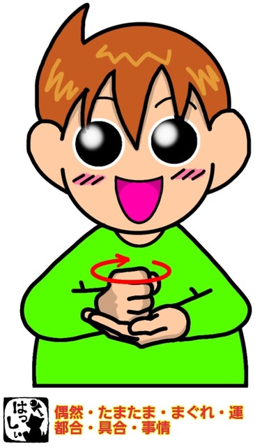 手話単語:209 【偶然】【たまたま】【具合】【事情】【まぐれ】【運】【都合】 2016年01月27日 こんにちはヾ(´ω`=´ω`)ノ【偶然・たまたま・まぐれ・運・都合・具合・事情】左手の手のひらを上に向け、右手はグーにして小指側を左手のひらにのせて回します。 それではまた((ヾ( ◍´꒳`◍ )いつも応援ありがとうございます!良ければ下↓のしゅうくんをポチっと押してね!ぐうぜん・うん・つごう・ぐあい・じじょう 「手話単語」カテゴリの最新記事 タグ :#生活一般・家庭#挨拶・感情・動き < 前の記事次の記事 > コメント コメント一覧 (2) 2. はっしぃ 2023年12月20日 08:31 はたぼーさん おはようございます。 一応「事情」とはあるけどあまり「事情」でこれを使ってるかというと?そんな見ない気が(笑) 話の流れ文章によっては、ほかの表現使われてる方が多い気がします。なんとなく。 1. はたぼー 2023年12月19日 18:01 事情を、説明しますの「事情]って「たまたま」と一緒だったんですね。 手話単語、強い味方です。 いつもありがとうございます😊❤️ コメントフォーム 名前 コメント 記事の評価 リセット リセット 顔 星 情報を記憶 コメントを投稿する