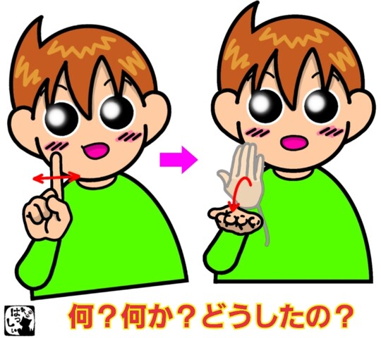 手話単語:82 【何?】【何か?】【どうしたの?】【どうしましたか?】 2015年10月09日 こんにちは(*・ω・)ノ【何?何か?どうしたの?・どうしましたか?】立てた人差し指を左右に振りって、右の手のひらを上に向けて振り下ろすように前に下します。疑問をもった表情が大切です(*´Д`*)ですが・・・ほとんどこの表現だけが多いかと思います。それではまた(○´ω`○)ノ いつも訪問・応援ポチありがとうございます!励みになりますのでこれからもよろしくおねがいします。ε=ε=ε=(●・д・ノ)ノ【。+゚:.感謝.:゚+。】 なに?・なにか? 「手話単語」カテゴリの最新記事 タグ :#挨拶・感情・動き < 前の記事次の記事 > コメント コメントフォーム 名前 コメント 記事の評価 リセット リセット 顔 星 情報を記憶 コメントを投稿する