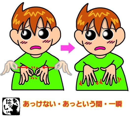 手話単語:1270 【あっけない】【あっという間】【一瞬】 2022年02月16日 こんにちは(*・ω・)ノ【あっけない・あっという間・一瞬】両手の親指と人差し指の2指で輪を作って左右から激しくぶつけ、パッと指を広げて指先は下に向けたまま両手を左右に素早く振ります。もういっちょ!【たちまち・あっけない・あっという間・一瞬】パッと指を広げて指先は下に向けたまま両手を左右に素早く振ります。それではまた((ヾ( ◍´꒳`◍ )いつも応援ありがとうございます!良ければ下↓のしゅうくんをポチっと押してね!いっしゅん・あっというま 「手話単語」カテゴリの最新記事 タグ :#挨拶・感情・動き < 前の記事次の記事 > コメント コメント一覧 (2) 2. はっしぃ 2022年02月16日 11:11 MAPPYさん コメントありがとうございます。 手話は両手で…というように思いがちですが、 会話なら… 実際ご飯を食べながらとか、 片手に何か持ってる時はもう片方の手と 顔の表情だけでやることはよくあります。 通訳とかになると、片手だけとかは 難しいですけどね😊 ゆっくり話せば口を読んでくれるろう者の方もいるので、全く意味が通じないってことは 少ないかと思います。 これは私の一意見ですけどね😅 0 はっしぃ がしました 1. MAPPY 2022年02月16日 10:16 片麻痺なんですけど、片手じゃ意味通じないですよね? 0 はっしぃ がしました コメントフォーム 名前 コメント 記事の評価 リセット リセット 顔 星 情報を記憶 コメントを投稿する