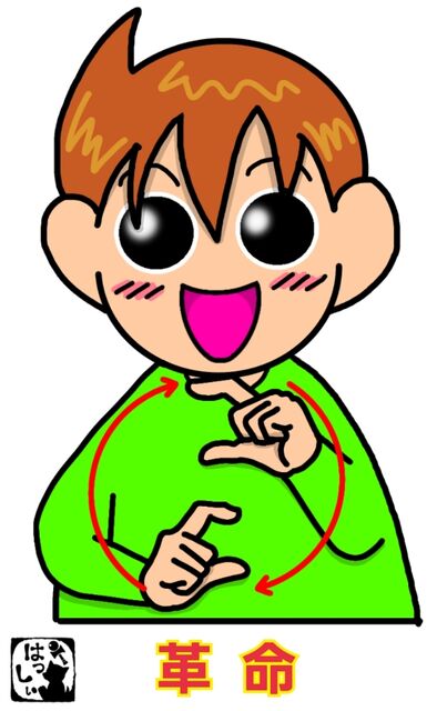 手話単語:1352 【革命】 2022年08月23日 こんにちは(*・ω・)ノ【革命】両手の人差し指と親指を少し丸めて、右手の2指の上に左手の2指を置いて上下逆の位置に置き換えます。それではまた(。・ω・)ノ゙いつも応援ポチありがとうございます!励みになりますのでこれからもよろしくおねがいします。ε=ε=ε=(●・д・ノ)ノ【。+゚:.感謝.:゚+。】 「手話単語」カテゴリの最新記事 < 前の記事次の記事 > コメント コメント一覧 (4) 4. はっしぃ 2022年08月24日 10:35 ウルトラマンさん 手話って本当似ている表現が多いので、私は色々よく間違ってます・・・。 0 はっしぃ がしました 3. ウルトラマン 2022年08月24日 09:04 はっしぃさん、アドバイスありがとうございました。 なるほど、「もっと」と「革命」は違うのですね。 勉強になりました。 ありがとうございます。 0 はっしぃ がしました 2. はっしぃ 2022年08月23日 09:13 ウルトラマンさん コメントありがとうございます。 「もっと、更に」の時は左手はそのままで右手だけを上に持っていってますが、 革命は両手を入れ替えます。 0 はっしぃ がしました 1. ウルトラマン 2022年08月23日 09:09 「もっと、更に」の手話に似ていますが、違うでしょうか? 0 はっしぃ がしました コメントフォーム 名前 コメント 記事の評価 リセット リセット 顔 星 情報を記憶 コメントを投稿する
