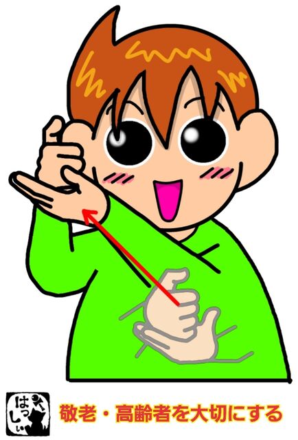 親指を曲げた右手を【老人】、左の手のひらにのせて上に上げます。