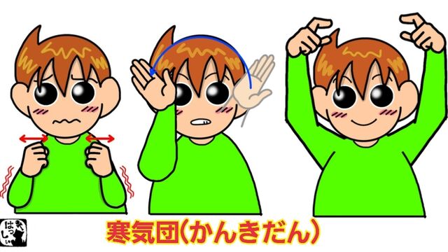 両手と体を縮こませて、グーにした両手を上に向けて左右に震わせ、【寒い】