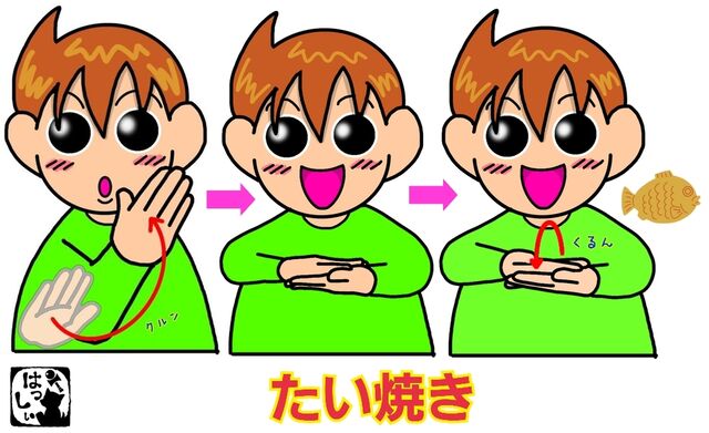 右手を開いて指は揃えた状態にして勢いよく反転させながら跳ね上げて、【たい】