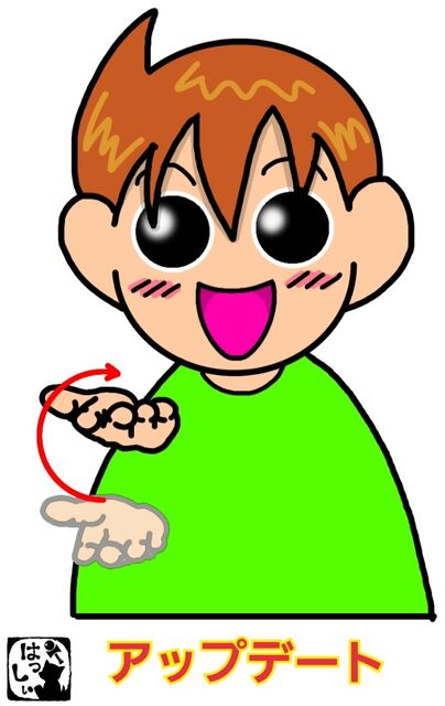 手話単語:1495 【アップデート】【アップデートする】 2023年01月06日 こんにちは(*・ω・)ノ【アップデート・アップデートする】右手の手のひらを上に、指先は前に向けたら、弧を描いて上にあげます。ランクを上げる様子の表現です。それではまた(。・ω・)ノ゙いつも応援ありがとうございます!良ければ下のしゅうくんをポチっと押してね! 「手話単語」カテゴリの最新記事 タグ :#IT関連用語 < 前の記事次の記事 > コメント コメント一覧 (4) 4. はっしぃ 2023年01月07日 20:15 Swimmy sheepさん いえいえ、ちゃんとした答えになってないですが・・・。 一番いいのはお近くのろう者の方たちに質問したほうがいいかもです! 「こういう時はどうする?」みたいな・・・。 昨日、私はサークルでろうの講師の方に質問ばかりしていましたw 0 はっしぃ がしました 3. Swimmy sheep 2023年01月07日 18:52 はっしぃさん、ありがとうございます。文脈によって使っていけるように、勉強していきます。 0 はっしぃ がしました 2. はっしぃ 2023年01月07日 10:44 Swimmy sheepさん 「レベルアップ」については、この表現もあるでしょうし、他にもたくさんありますね。なので、文脈というか話の内容というか、それに合わせた表現をチョイスしたらいいと思います。今回はあくまで【アップデート】でご紹介しました。 よろしくお願いします。 0 はっしぃ がしました 1. Swimmy sheep 2023年01月06日 10:05 アップデートは、レベルアップって表現も同じになるのでしょうか? レベル+高いがレベルアップかなと思ってたのですが、これを見て、ふと思いました。 0 はっしぃ がしました コメントフォーム 名前 コメント 記事の評価 リセット リセット 顔 星 情報を記憶 コメントを投稿する