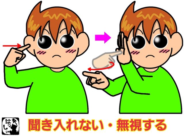 手話単語:1648 【聞き入れない】【無視する】 2023年04月25日 こんにちは(*・ω・)ノ【聞き入れない・無視する】右手の人差し指を耳に近づけて、右耳のところに置いた左の手のひらに右手人差し指を当てて跳ね返します。右の表現だけで表す方もいます。それではまた((ヾ( ◍´꒳`◍ )いつも応援ありがとうございます!良ければ下↓のしゅうくんをポチっと押してね!ききいれない・むしする 「手話単語」カテゴリの最新記事 タグ :#挨拶・感情・動き < 前の記事次の記事 > コメント コメント一覧 (2) 2. はっしぃ 2023年04月25日 11:23 ウルトラマンさん 私もそのタイプです(((o(*゚▽゚*)o))) 0 はっしぃ がしました 1. ウルトラマン 2023年04月25日 09:05 私は「聞き入れない」よりも、「聞き流す(見流す?)」タイプです(笑) 0 はっしぃ がしました コメントフォーム 名前 コメント 記事の評価 リセット リセット 顔 星 情報を記憶 コメントを投稿する