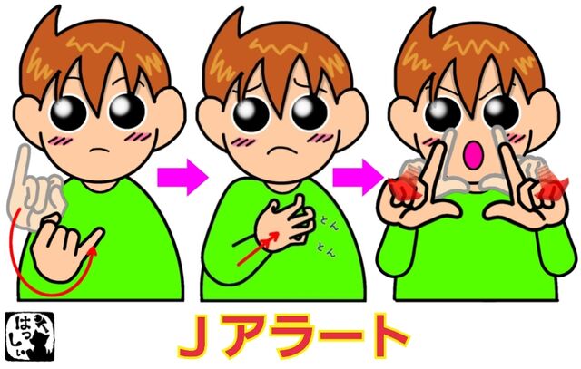 手話単語:1803 【Jアラート】 2023年11月22日 こんにちは(*・ω・)ノ【Jアラート】小指でアルファベットの【J】をかいて、右手の5指を折り曲げて、指先でトントンと胸をたたいたら、両手の親指と人差し指を伸ばして向き合わせ、口元から前に出します。【J】+【危ない】+【発表(報告)】で表します。 それではまた((ヾ( ◍´꒳`◍ )いつも応援ありがとうございます!良ければ下↓のしゅうくんをポチっと押してね!じぇいあらーと 「手話単語」カテゴリの最新記事 タグ :#災害・気象・環境関係 < 前の記事次の記事 > コメント コメント一覧 (2) 2. はっしぃ 2023年11月24日 14:00 swimmy sheepさん こんにちは。 正直、私の場合は慣れ過ぎてしまって「あ、またか・・・。」と あまり気にせずにいました。それも良くないんですけどね・・・。 なのでNHKもみていないのであります・・・。 0 はっしぃ がしました 1. swimmy sheep 2023年11月22日 08:32 何事もなく、良かったです。 どうなるか気になって眠れなかったら、早寝している母に、今朝になって「何のこと?」と言われました😁 手話通訳の方に文字がかぶると、ちょっと気になってはしまいましたが… 0 はっしぃ がしました コメントフォーム 名前 コメント 記事の評価 リセット リセット 顔 星 情報を記憶 コメントを投稿する