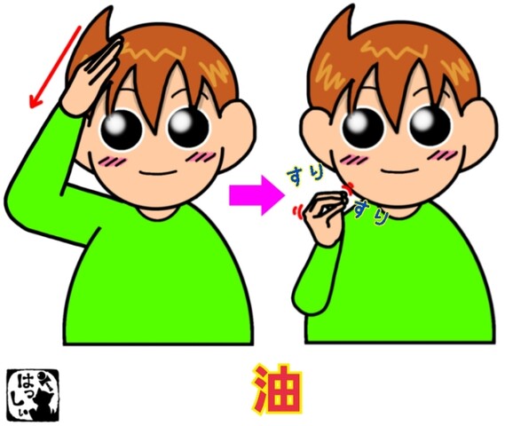 手話単語:1835 【油】 2023年12月24日 こんにちは(*・ω・)ノ【油】右の手のひらを髪にあてて撫でるようにおろして、右手の親指と他の4指の指先を左の方へ向けてスリスリこすり合わせます。それではまた((ヾ( ◍´꒳`◍ )いつも応援ありがとうございます!良ければ下↓のしゅうくんをポチっと押してね!あぶら 「手話単語」カテゴリの最新記事 タグ :#生活一般・家庭#食べ物・飲み物・料理関係 < 前の記事次の記事 > コメント コメントフォーム 名前 コメント 記事の評価 リセット リセット 顔 星 情報を記憶 コメントを投稿する