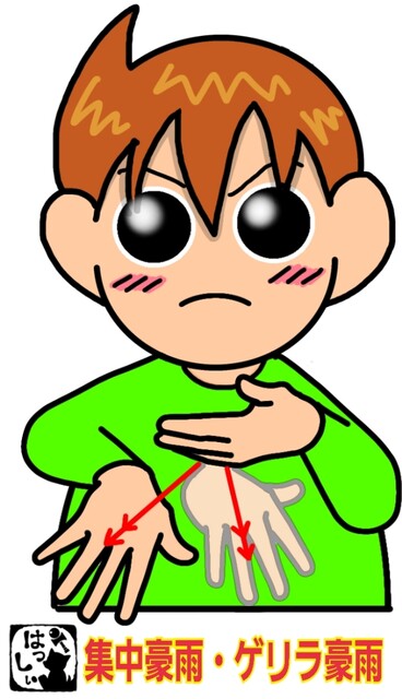 手話単語:1865 【集中豪雨】【ゲリラ豪雨】 2024年02月02日 こんにちは(*・ω・)ノ【集中豪雨・ゲリラ豪雨】手のひらを上に向けた左手の甲から、指先を下にした右手を勢いよく2,3回下ろします。左手の雨雲から集中的に降る雨の様子です。 それではまた((ヾ( ◍´꒳`◍ )いつも応援ありがとうございます!良ければ下↓のしゅうくんをポチっと押してね!しゅうちゅうごうう・げりらごうう 「手話単語」カテゴリの最新記事 タグ :#災害・気象・環境関係 < 前の記事次の記事 > コメント コメントフォーム 名前 コメント 記事の評価 リセット リセット 顔 星 情報を記憶 コメントを投稿する