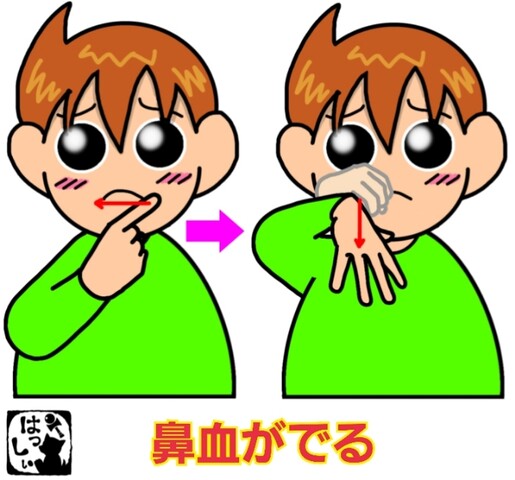 つまんだ右手を鼻の下において、勢いよく下へだしながら指を開きます。