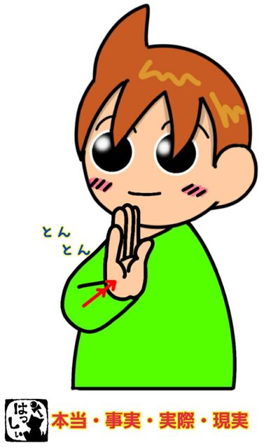 手話単語:97 【本当】【事実】【実際】【現実】 2015年10月14日 こんにちは(*・ω・)ノ【本当・事実・実際・現実】右手のひらを立てて、顎に人差し指側をトントンと当てます。「本当に頑張っていますね。」「実際にあったことです。」それではまた(。・ω・)ノ゙いつも応援ありがとうございます!良ければ下のしゅうくんをポチっと押してね!ほんとう・じじつ・じっさい・げんじつ 「手話単語」カテゴリの最新記事 < 前の記事次の記事 > コメント コメントフォーム 名前 コメント 記事の評価 リセット リセット 顔 星 情報を記憶 コメントを投稿する