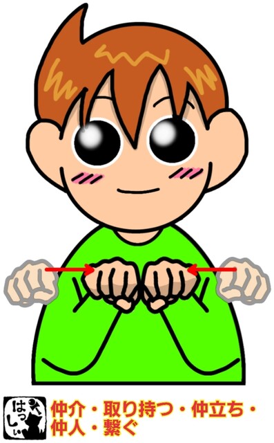 手話単語:1942 【仲介】【仲介する】【取り持つ】【仲立ち】【仲立ちする】【仲人】【繋ぐ】 2024年04月21日 こんにちは(*・ω・)ノ【仲介・取り持つ・仲立ち・仲人・繋ぐ】両手をグーにして左右から引き寄せて親指側をくっつけます。それではまた((ヾ( ◍´꒳`◍ )いつも応援ありがとうございます!良ければ下↓のしゅうくんをポチっと押してね!ちゅうかい・とりもつ・なこうど・なかだち・つなぐ 「手話単語」カテゴリの最新記事 タグ :#生活一般・家庭 < 前の記事次の記事 > コメント コメントフォーム 名前 コメント 記事の評価 リセット リセット 顔 星 情報を記憶 コメントを投稿する