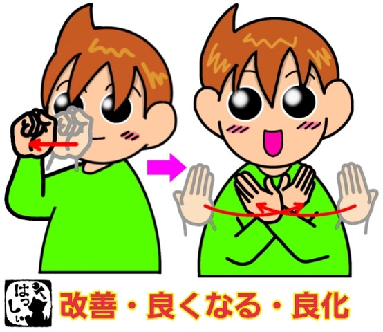 手話単語:2082 【改善】【改善する】【良くなる】【良化】【良化する】 2024年09月17日 こんにちは(*・ω・)ノ【改善・改善する・良くなる・良化・良化する】グーにした右手を花に当てて少し前に出し、【良い】開いた手のひらを外側から左右引き寄せて、体の中心で交差させます。【変わる】 それではまた((ヾ( ◍´꒳`◍ )いつも応援ありがとうございます!良ければ下↓のしゅうくんをポチっと押してね!かいぜん・かいぜんする・よくなる・りょうか・りょうかする 「手話単語」カテゴリの最新記事 タグ :#生活一般・家庭 < 前の記事次の記事 > コメント コメント一覧 (2) 2. はっしぃ 2024年09月19日 10:14 はたぼーさん こんにちは! とにかくろう者の方とたくさんお話をするほうがここのブログより 目からウロコがあふれ出ますよw 私はほんのサポートですから・・・。 0 はっしぃ がしました 1. はたぼー 2024年09月18日 22:48 改善と良くなるは、同じ手話なんですね。 目からウロコです✨✨✨ 一つの手話に、関連した言葉を載せてくれてるので本当に助かります。 ありがとうございます😊 0 はっしぃ がしました コメントフォーム 名前 コメント 記事の評価 リセット リセット 顔 星 情報を記憶 コメントを投稿する