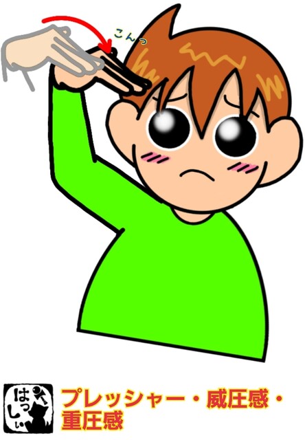 手話単語:2085 【プレッシャー】【威圧感】【重圧感】 2024年09月20日 こんにちは(*・ω・)ノ2パターンご紹介します(●´ω`●)【プレッシャー・威圧感・重圧感】右手の4指を揃えてまっすぐ伸ばして【コ】のような形にしたら、指先で頭を強く押します。もういっちょ!【プレッシャー・威圧感・重圧感】両手の指を少し曲げて、指先から両肩にあてて少し両肩を落とします。圧の重さで体の動きの強弱を使って表します。それではまた((ヾ( ◍´꒳`◍ )いつも応援ありがとうございます!良ければ下↓のしゅうくんをポチっと押してね!ぷれっしゃー・いあつかん・じゅうあつかん 「手話単語」カテゴリの最新記事 タグ :#挨拶・感情・動き < 前の記事次の記事 > コメント コメントフォーム 名前 コメント 記事の評価 リセット リセット 顔 星 情報を記憶 コメントを投稿する