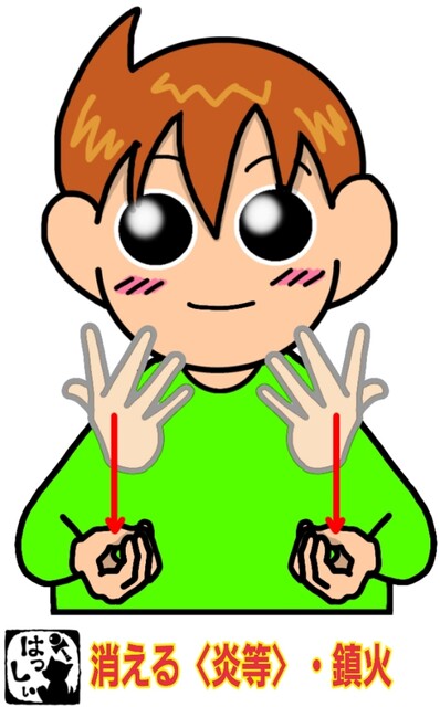 手話単語:2092 【消える〈炎等〉】【鎮火】 2024年09月29日 こんにちは(*・ω・)ノ【消える〈炎等〉・鎮火】開いた指と手のひらを上に向けた両手を同時にゆっくりすぼめながら下ろします。それではまた((ヾ( ◍´꒳`◍ )いつも応援ありがとうございます!良ければ下↓のしゅうくんをポチっと押してね!きえる・ちんか 「手話単語」カテゴリの最新記事 タグ :#生活一般・家庭 < 前の記事次の記事 > コメント コメントフォーム 名前 コメント 記事の評価 リセット リセット 顔 星 情報を記憶 コメントを投稿する