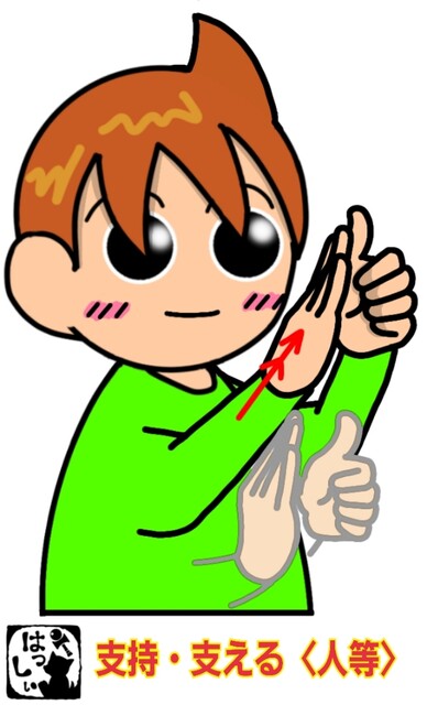 手話単語:2298 【支持】【支持する】【支える〈人等〉】 2025年05月09日 はじめましての方はこちらへ👇こんにちは(*・ω・)ノ【支持・支持する・支える〈人等〉】立てた左手の親指の背側を右手で斜め下から押し上げるようにたたきます。 それではまた((ヾ( ◍´꒳`◍ )いつも応援ありがとうございます!良ければ下↓のしゅうくんをポチっと押してね!しじ・しじする・ささえる 「手話単語」カテゴリの最新記事 タグ :#生活一般・家庭#社会・政治関係 < 前の記事次の記事 > コメント コメント一覧 (2) 2. はっしぃ 2025年05月09日 15:06 たんぽぽと蝶さん こんにちは^^ コメントありがとうございます。 そうですね。 うちのサークルでもろう者講師の前で辞書を開いて、 注意された人はいます。私ももちろん注意します。 「わからないことがあれば講師に聞いてください。」と言っても、 「聞き方がわからないから聞けない(手話ができないから聞けない。)」というのですが、それじゃ意味ないですものね・・・。 とにかく身振り手振りでわかる範囲手話を使って質問してもらうようにしています。 講師がこちらに「なに?」といえば補足で説明したりはしますが、 辞書にたよらず、自分で伝えたいと思えばしっかり講師は受け止めてくれるのですが・・・。 このブログはみなさんの学習補助で使っていただけるのが一番だと思うので、 これからもよろしくお願いします。 0 はっしぃ がしました 1. たんぽぽと蝶 2025年05月09日 14:51 こんにちは。あなたのブログをいつもみています。とても分かりやすくてとても可愛いです。 私はサークルで健聴者に手話を教えることがあります。その時に健聴者の人が机に辞書をおいて私の手話を見る度に辞書を開くのがとても嫌です。わからなければ私に聞いてほしいのに聞かないで辞書をひらく。 私ははじまるまえに辞書はしまってほしいと伝えます。私は辞書は持ちません。 だけどたまに言葉を忘れた時このブログをスマホでみます。 あと、どんな表現がほかにあるとかもみます。 ありがとう。 0 はっしぃ がしました コメントフォーム 名前 コメント 記事の評価 リセット リセット 顔 星 情報を記憶 コメントを投稿する