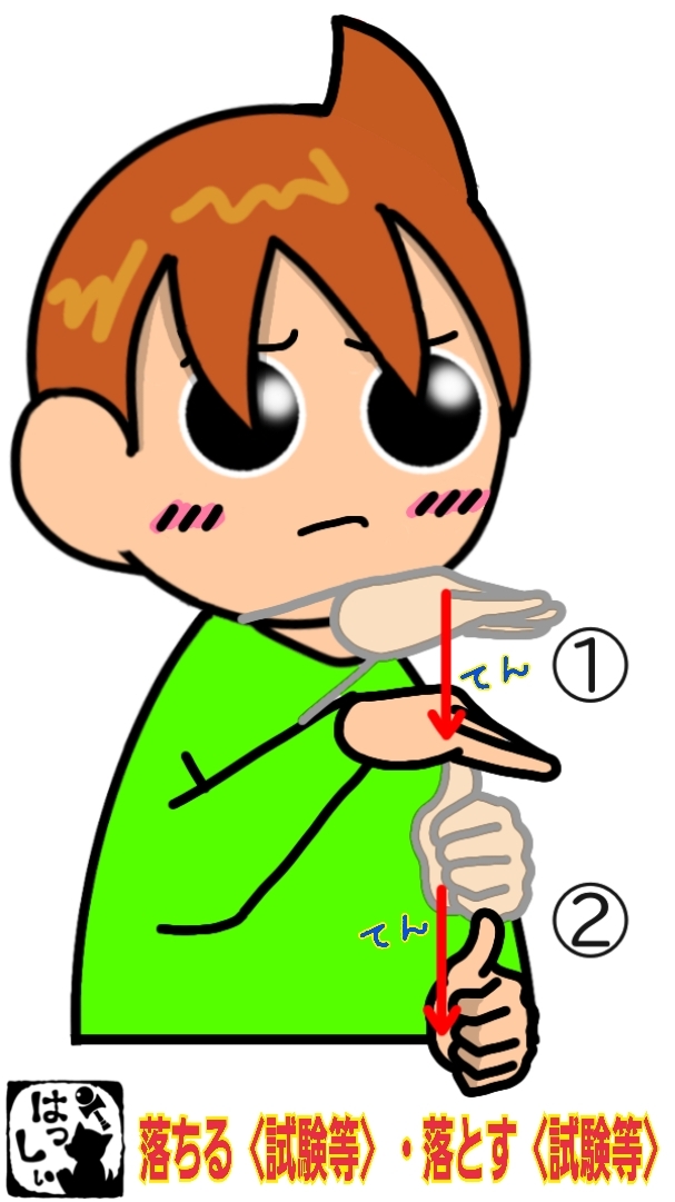 手話単語:2299 【落ちる〈試験等〉】【落とす〈試験等〉】 2025年05月10日 はじめましての方はこちらへ👇こんにちは(*・ω・)ノ【落ちる〈試験等〉・落とす〈試験等〉】立てた左手の親指の指先を右手の手のひらで、テン!テン!とたたき落とします。それではまた((ヾ( ◍´꒳`◍ )いつも応援ありがとうございます!良ければ下↓のしゅうくんをポチっと押してね!おちる・おとす 「手話単語」カテゴリの最新記事 タグ :#生活一般・家庭#子ども・教育関係 < 前の記事次の記事 > コメント コメントフォーム 名前 コメント 記事の評価 リセット リセット 顔 星 情報を記憶 コメントを投稿する