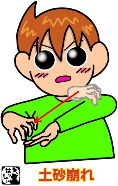 手話単語:2332 【土砂崩れ】 2025年06月15日 はじめましての方はこちらへ👇こんにちは(*・ω・)ノ【土砂崩れ】右手の5指を折り曲げて、斜めに伸ばした左腕を削るように下ろします。 それではまた((ヾ( ◍´꒳`◍ )いつも応援ありがとうございます!気が向いたら下↓のしゅうくんをポチっと押してね!どしゃくずれ 「手話単語」カテゴリの最新記事 タグ :#災害・気象・環境関係 < 前の記事次の記事 > コメント コメントフォーム 名前 コメント 記事の評価 リセット リセット 顔 星 情報を記憶 コメントを投稿する
