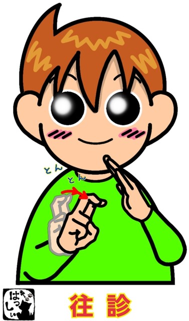 手話単語:2408 【往診】 2025年10月03日 はじめましての方はこちらへどうぞ👇こんにちは(*・ω・)ノ【往診】左手は斜めに構えて、【家】左の手の下で人差し指と中指を折り曲げて(指文字の【ロ】の形)、2指をトントンと2回振り下ろします。医師が家で診察する様子の表現です。 それではまた((ヾ( ◍´꒳`◍ )いつも応援ありがとうございます!気が向いたら下↓のしゅうくんをポチっと押してね!おうしん 「手話単語」カテゴリの最新記事 タグ :#医療・介護・福祉関係#生活一般・家庭 < 前の記事次の記事 > コメント コメントフォーム 名前 コメント 記事の評価 リセット リセット 顔 星 情報を記憶 コメントを投稿する