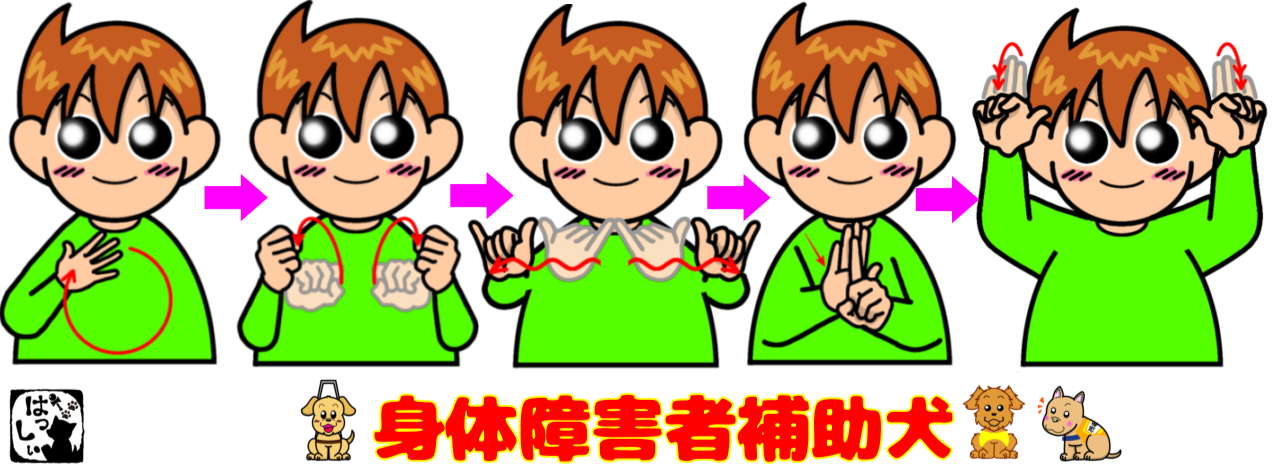 両手の親指をこめかみにつけて、伸ばした4指をピコピコと折り曲げます。【犬】