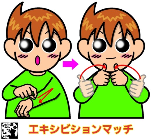 手話単語:2446 【エキシビションマッチ】 2025年11月10日 はじめましての方はこちらへ👇こんにちは(*・ω・)ノ【エキシビションマッチ】右手の人差し指と親指でつまんだ形にして、左腕の手首あたりから腕へ【Λ】の形を描き、【特別・特典】両手の親指を立てたら、両手こぶしを左右から力強く1回ぶつけます。【試合】 それではまた((ヾ( ◍´꒳`◍ )いつも応援ありがとうございます!気が向いたら下↓のしゅうくんをポチっと押してね!えきしびじょんまっち 「手話単語」カテゴリの最新記事 タグ :#スポーツ#デフリンピック・オリンピック・パラリンピック関係 < 前の記事次の記事 > コメント コメント一覧 (3) 3. はっしぃ 2025年11月10日 19:07 さやママさん コメントありがとうございます😊 読ませていただきました。 なんか、少しでも息子さんの言いたいことが言える環境になって良かったですね! 先生のアプローチがとても良かったのではないかな?と思います。 ブログのイラストが息子さんに気に入っていただけたことも本当にプラスに動いてくれて。 少しでもお役に立てたこと、 とても嬉しく思います。 これからもよろしくお願いします。 0 はっしぃ がしました 2. さやママ 2025年11月10日 18:14 すみません。 3歳ではなく4歳です。間違えて書き込んでしまいました。 0 はっしぃ がしました 1. さやママ 2025年11月10日 18:10 はっしぃ様 今回はお礼を言いたくてコメントします。 3歳の息子は耳は聞こえますが、 別の障害で言葉が上手く話せません。 聞こえているから私たちの言いたいことを理解してくれますが、自分の言いたいことが言えず癇癪をあげる毎日でした。本当に主人も私もどうしていいのか毎日毎日泣いていました。色んなことがありました。 去年、療育の先生がこちらのイラストを使ったカードを使って息子と会話をしてくれました。息子はそれまで絵本を読んだりしても興味をしめしませんでしたが、こちらの男の子のイラストには興味をもち、先生の使われるカードを使って色々自分の気持ちを伝えてくれました。それから、1年少し経ちましたが、息子はこちらのブログの単語を覚えて「手話」を使って私たちに伝えてくれます。もちろん私たちも覚えて声を出しながら息子に手話をします。今年の春から私と息子は手話サークルに通って手話を勉強しています。そこでもこちらのブログのイラストが資料として使われていました。 本当に本当にありがとうございます。息子と私たち夫婦にとって光がさしたとき、感謝しかありませんでした。本当に本当に本当にありがとうございました。 これからもどうぞよろしくお願いします。 0 はっしぃ がしました コメントフォーム 名前 コメント 記事の評価 リセット リセット 顔 星 情報を記憶 コメントを投稿する