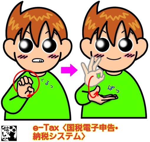 手話単語:2457 【e-Tax〈国税電子申告・納税システム〉】 2025年11月22日 はじめましての方はこちらへ👇こんにちは(^▽^)/【e-Tax〈国税電子申告・納税システム〉】右手をアルファベットの【E】にして小さくクルッと回して、右手の親指と人差し指2指の輪を開きながら手の平を上にして下ろし、指先を自分側に向けます。【税金】 それではまた((ヾ( ◍´꒳`◍ )いつも応援ありがとうございます!気が向いたら下↓のしゅうくんをポチっと押してね!いーたっくす・イータックス・こくぜいでんししんこく・のうぜいしすてむ 「手話単語」カテゴリの最新記事 タグ :#生活一般・家庭#社会・政治関係 < 前の記事次の記事 > コメント コメント一覧 (2) 2. はっしぃ 2025年11月23日 10:01 湯城さん おはようございます! コメントおそくなりすみません。 お役に立ててるようで良かったです! ろうの方や難聴の方に使っていただけるのは本当に嬉しいです。 今後もよろしくお願いします。 0 はっしぃ がしました 1. 湯城 2025年11月22日 22:12 私は聴覚障害者です。 いつも調べる時ここを使わせてもらってます。 うちの娘は難聴です。 娘もつかってます しゅうくんだいすきです。ありがとうございます。 0 はっしぃ がしました コメントフォーム 名前 コメント 記事の評価 リセット リセット 顔 星 情報を記憶 コメントを投稿する