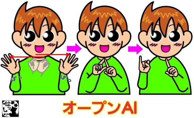 手話単語:2487 【オープンAI】 2025年12月22日 はじめましての方はこちらへ👇こんにちは(^▽^)/【オープンAI】指文字の【オ】にして交差させた両手を開きながら左右に引き離し、両手でアルファベットの【A】を示して、残した左手の人差し指の横で【I】を示します。 それではまた((ヾ( ◍´꒳`◍ )いつも応援ありがとうございます!気が向いたら下↓のしゅうくんをポチっと押してね!おーぷんえーあい 「手話単語」カテゴリの最新記事 タグ :#IT関連用語 < 前の記事次の記事 > コメント コメントフォーム 名前 コメント 記事の評価 リセット リセット 顔 星 情報を記憶 コメントを投稿する