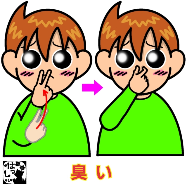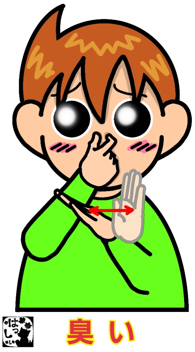 手話単語:2501 【臭い(くさい)】 2026年01月09日 はじめましての方はこちらへ👇こんにちは(^▽^)/【臭い(くさい)】右手の人差し指と中指の2指の指先を下から鼻に近づけ、右手の人差し指と親指の2指で鼻をつまみます。もういっちょ!臭いのレベルで表情も動きも変えれば伝わりやすいです。それではまた((ヾ( ◍´꒳`◍ )いつも応援ありがとうございます!気が向いたら下↓のしゅうくんをポチっと押してね!くさい・クサイ 「手話単語」カテゴリの最新記事 タグ :#挨拶・感情・動き < 前の記事次の記事 > コメント コメントフォーム 名前 コメント 記事の評価 リセット リセット 顔 星 情報を記憶 コメントを投稿する