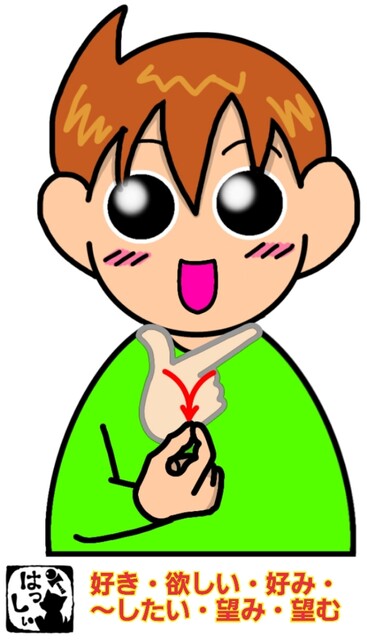 手話単語:10 【好き】【~したい】【欲しい】【好み】【望み】【望む】 2015年09月19日 こんにちは(*・ω・)ノ【好き・~したい・欲しい・望み・望む】右手の親指と人差し指をひらいてアゴの下に置き、指を閉じながら下にさげます。 それではまた(。・ω・)ノ゙いつも応援ポチありがとうございます!励みになりますのでこれからもよろしくおねがいします。ε=ε=ε=(●・д・ノ)ノ【。+゚:.感謝.:゚+。】すき・ほしい・このみ・のぞみ・のぞむ 「手話単語」カテゴリの最新記事 タグ :#生活一般・家庭#挨拶・感情・動き < 前の記事次の記事 > コメント コメント一覧 (4) 4. はっしぃ 2020年11月02日 20:52 手話勉強中のタマザラシさん コメントありがとうございます。 お役に立てて良かったです。 大切な表現なのに抜けていたのでこちらも助かりしました😅 3. 手話勉強中のタマザラシ 2020年11月02日 20:48 ありがとうございます!!! とても助かります!また拍手👏1000回しました!!(笑) 2. はっしぃ 2020年11月02日 09:11 手話勉強中のタマザラシさん コメントありがとうございました。 すみません、まだUPしてなかったみたいなので本日UPします。 よろしくお願いします。 1. 手話勉強中のタマザラシ 2020年11月01日 23:35 「なる」というのは手話で表すにはどうすればよいのですか? コメントフォーム 名前 コメント 記事の評価 リセット リセット 顔 星 情報を記憶 コメントを投稿する