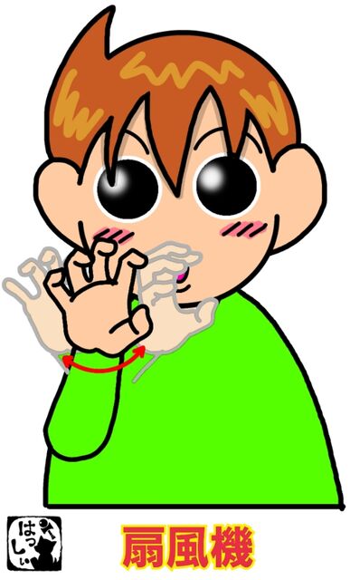 手話単語:339 【扇風機】 2016年06月11日 こんにちはv( ̄∇ ̄)v【扇風機】右手の指を少し湾曲させて手のひらは相手側に向け、手首を軸にして左右に振ります。扇風機の首が動くイメージです。いい大人なのに・・・毎年扇風機に向かって「アァァァァァァァ~。ワレワレハァ~。」と言ってます・・・。それではまた(。・ω・)ノ゙いつも応援ポチありがとうございます!励みになりますのでこれからもよろしくおねがいします。ε=ε=ε=(●・д・ノ)ノ【。+゚:.感謝.:゚+。】 「手話単語」カテゴリの最新記事 タグ :#家電製品#季節・イベント < 前の記事次の記事 > コメント コメントフォーム 名前 コメント 記事の評価 リセット リセット 顔 星 情報を記憶 コメントを投稿する