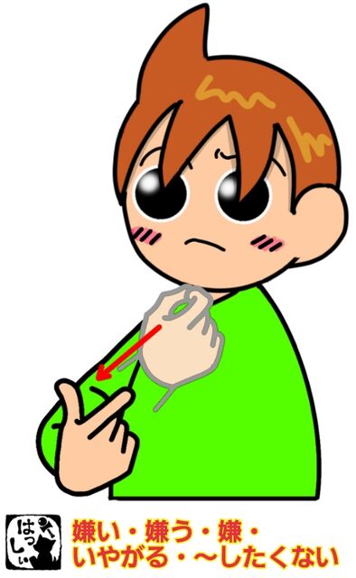 手話単語:36 【嫌い】【嫌う】【嫌】【いやがる】【したくない】 2015年09月22日 こんにちは(*・ω・)ノ2パターンご紹介します(⌒∇⌒)【嫌い・嫌・嫌う・いやがる・~したくない】 顎のあたりに親指と人差し指を 輪にした2指をつけて、 開きながら斜め前に出します。 もういっちょ!4指の背を顎の下に当てて 顎から手を払うように下におろします。 それではまた(○´ω`○)ノ いつも訪問・応援ポチありがとうございます!励みになりますのでこれからもよろしくおねがいします。ε=ε=ε=(●・д・ノ)ノ【。+゚:.感謝.:゚+。】 きらい・きらう・いや 「手話単語」カテゴリの最新記事 < 前の記事次の記事 > コメント コメントフォーム 名前 コメント 記事の評価 リセット リセット 顔 星 情報を記憶 コメントを投稿する