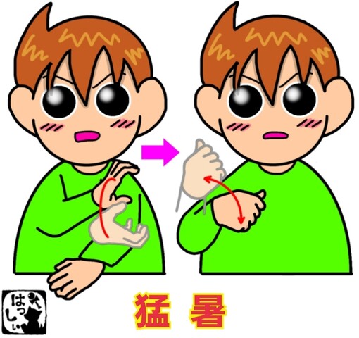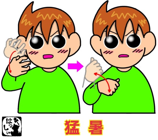 手首を使って前にひねったあと、うちわを仰ぐ仕草をします。