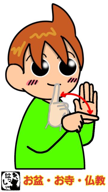 手話単語:395 【お盆】【お寺】【仏教】 2016年08月11日 こんにちはヾ(´ω`=´ω`)ノ【お盆・お寺・仏教】左手は指を揃えてまっすぐ立て、右手は人差し指をまっすぐ伸ばして、何かを叩くように2回上下させます。木魚を叩くしぐさです。【夏】+両手を合わせて拝む=【お盆】もあります。それではまた((ヾ( ◍´꒳`◍ )いつも応援ありがとうございます!良ければ下↓のしゅうくんをポチっと押してね!おぼん・おてら・ぶっきょう 「手話単語」カテゴリの最新記事 タグ :#季節・イベント < 前の記事次の記事 > コメント コメントフォーム 名前 コメント 記事の評価 リセット リセット 顔 星 情報を記憶 コメントを投稿する