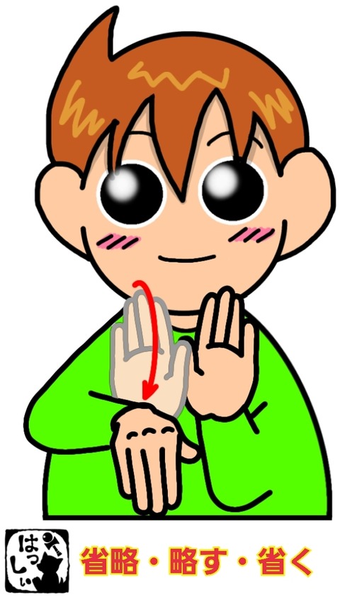 手話単語:2224 【省略】【略す】【省く】 2025年02月07日 こんにちは(*・ω・)ノ【省略・略す・省く】右手の親指側を左手の手のひらにつけて、右手の指先を下に向けておろします。余分なものを削り落とす表現です。それではまた((ヾ( ◍´꒳`◍ )いつも応援ありがとうございます!良ければ下↓のしゅうくんをポチっと押してね!しょう ... 続きを読む