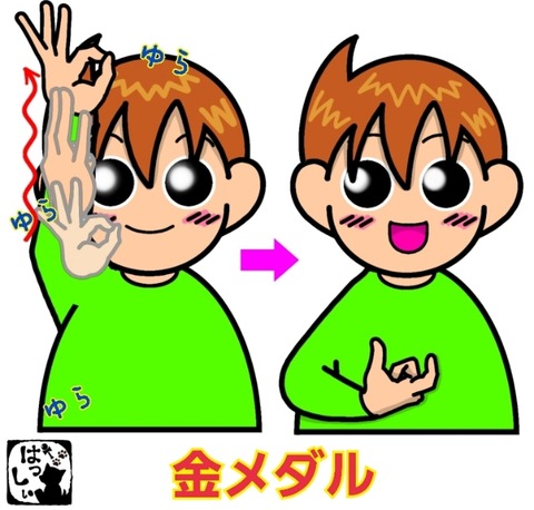 手話単語:2415 【金メダル】 2025年10月11日 はじめましての方はこちらへ👇こんにちは(^▽^)/【金メダル】右手の人差し指と親指の2指で作った輪をユラユラ揺らしながら上にあげ、【金】指先を上にした人差し指と親指で丸い形を作り、胸の前に置きます。【メダル】 それではまた((ヾ( ◍´꒳`◍ )いつも応援ありがと ... 続きを読む
