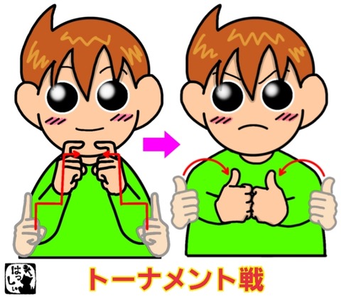 手話単語:2044 【トーナメント戦】 2024年08月01日 こんにちは(*・ω・)ノ【トーナメント戦】両手の人差し指を上げて折り曲げるの動作を繰り返しながら指先を近づけ、両手の親指を立てたら、両手こぶしを左右から力強く1回ぶつけます。 それではまた((ヾ( ◍´꒳`◍ )いつも応援ありがとうございます!良ければ下↓のしゅうくん ... 続きを読む