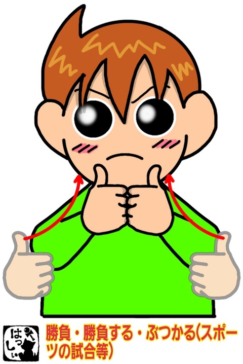 手話単語:1603 【勝負】【勝負する】【ぶつかる〈スポーツの試合等〉】 2023年03月11日 こんにちは(*・ω・)ノ【勝負・勝負する・ぶつかる〈スポーツの試合等〉】両手の親指を立てたら左右から斜め上に力強く近づけてぶつけます。 それではまた((ヾ( ◍´꒳`◍ )いつも応援ありがとうございます!良ければ下↓のしゅうくんをポチっと押してね!しょうぶ・しょうぶす ... 続きを読む