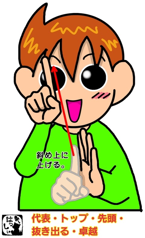 手話単語:1263 【代表】【トップ】【先頭】【抜き出る】【卓越】【選抜】【断トツ】 2021年11月10日 こんにちは(*・ω・)ノ【代表・トップ・先頭・抜き出る・卓越・選抜・断トツ】斜め上に向けた左手のひら側から、伸ばした右手の人差し指を前方斜め上にあげます。集団の中から抜き出る表現です。それではまた((ヾ( ◍´꒳`◍ )いつも応援ありがとうございます!良ければ下↓の ... 続きを読む