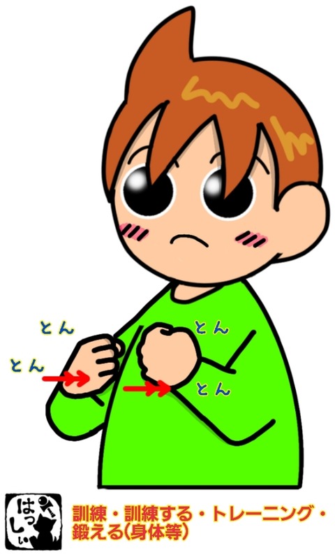 手話単語:1386 【訓練】【訓練する】【トレーニング】【トレーニングする】【稽古】【鍛える(身体等)】 2022年10月07日 こんにちは(*・ω・)ノ【訓練・訓練する・トレーニング・トレーニングする・鍛える(身体等)・稽古】両手をグーにして両胸を同時にトントンと2回たたきます。それではまた((ヾ( ◍´꒳`◍ )いつも応援ありがとうございます!良ければ下↓のしゅうくんをポチっと押してね!く ... 続きを読む