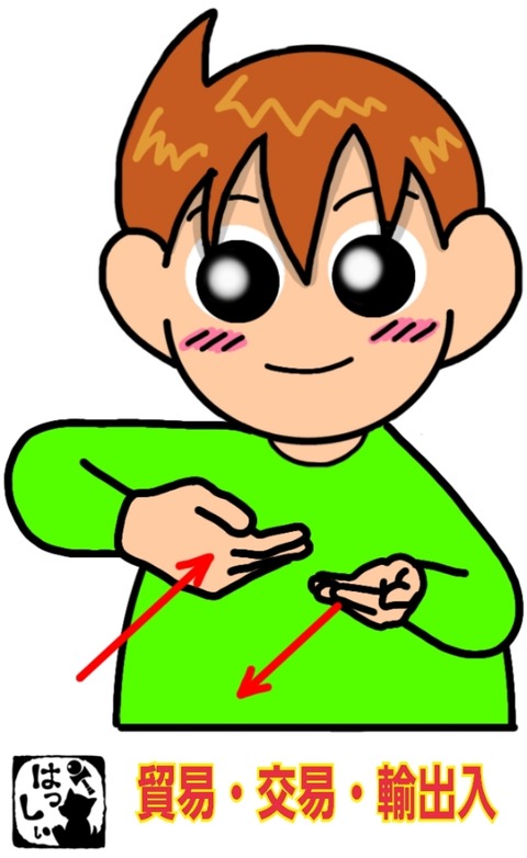 手話単語:2290 【貿易】【交易】【輸出入】 2025年05月01日 はじめましての方はこちらへ👇こんにちは(*・ω・)ノ【貿易・交易・輸出入】手のひらを上に向けて少し湾曲させたら、右手は自分側に引き寄せて左手は前方に向けて動かします。船の出入りで貿易を表現しています。 それではまた((ヾ( ◍´꒳`◍ )いつも応援ありがとうございます ... 続きを読む