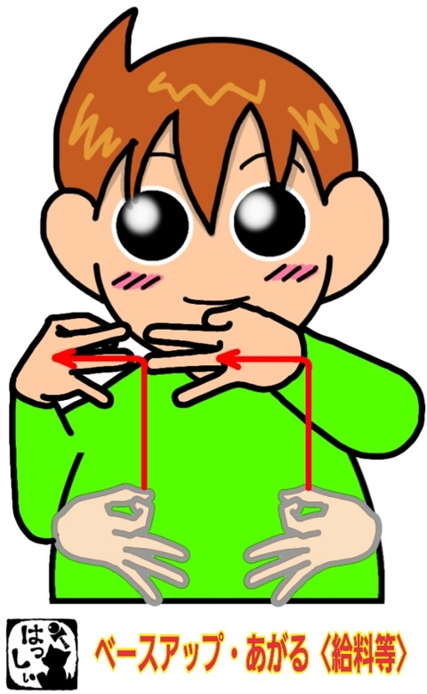 手話単語:2289 【ベースアップ】【あがる〈給料等〉】 2025年04月29日 はじめましての方はこちらへどうぞ👇こんにちは(*・ω・)ノ【ベースアップ・あがる〈給料等〉】両手の人差し指と親指2指で作った輪を同時に上げてから、右方へ動かします。 それではまた((ヾ( ◍´꒳`◍ )いつも応援ありがとうございます!良ければ下↓のしゅうくんをポチっと ... 続きを読む