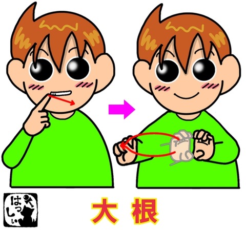 手話単語:1564 【大根】 2023年02月13日 こんにちは( ´_ゝ`)ノ【大根】右の人差し指で「イ~!」っとした歯を指差して指の先を左方向へ振り、【白】両手を半円形のして親指同士をつけたら、右手を右へ移動させながら手をグーにします。 それではまた((ヾ( ◍´꒳`◍ )いつも応援ありがとうございます!良ければ下 ... 続きを読む