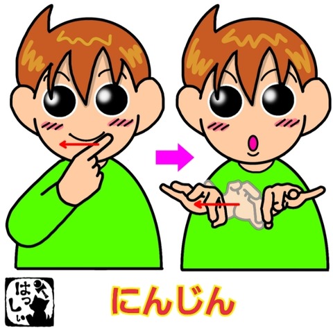 手話単語:1563 【人参】【にんじん】 2023年02月12日 こんにちはv( ̄∇ ̄)v【にんじん】右手の人差し指を唇に沿って左から右に移動させて、【赤】両手はそれぞれの親指と人差し指で輪を作って2つの輪をくっつけて、右手だけス~ッと右へ動かします。1本でもにんじんなんだよ・・・。 それではまた((ヾ( ◍´꒳`◍ )いつも応援 ... 続きを読む